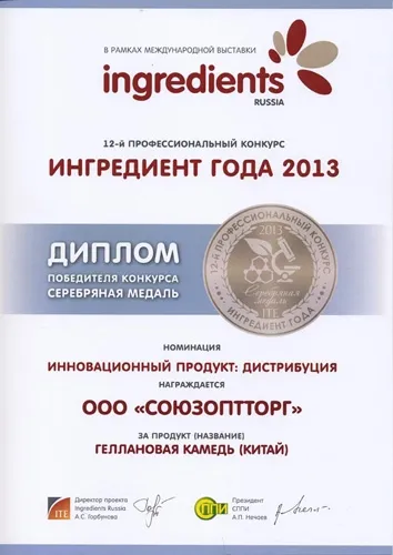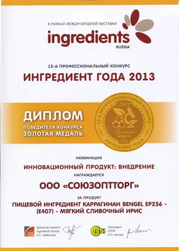 15 марта 2013 года были подведены итоги конкурса «Ингредиент года», который ежегодно проводит Союз производителей пищевых ингредиентов в рамках выставки «Ingredients Russia». Одним из победителей стала Группа компаний «Союзоптторг», а точнее ингредиенты, которые мы эксклюзивно представляем на российском рынке.