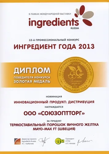 Еще одна высшая награда была присуждена ГК «Союзоптторг» за термостабильный порошок яичного желтка Mayo-Max FT (производитель Källbergs, Швеция).