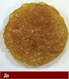 Как видно на фотографиях, цилиндрическая форма начинки с пектином АРА 311 сохранилась на 95%, что является наглядным доказательством её высокой термостабильности и отличным результатом для такого жесткого тестирования. Очень важно, что из начинки, несмотря на прямой контакт с горячей металлической поверхностью, не выделился сироп.