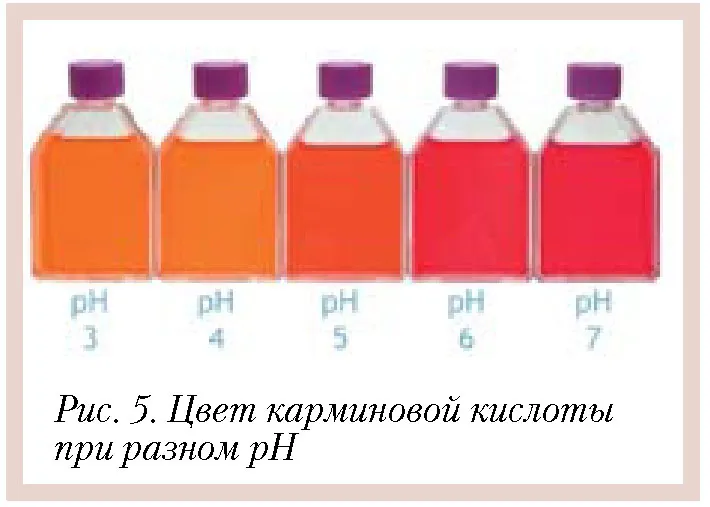 С повышением рН карминовая кислота изменяет оттенок (становится более красным), но сохраняет красящую способность вне зависимости от рН (рис. 5).