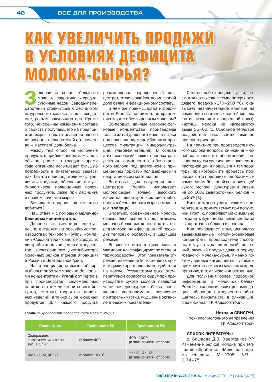 Во-вторых, для получения концентратов Promilk используют молоко-сырье только высокого качества; действуют жесткие требования к безопасности сырого молока (см. таблицу).