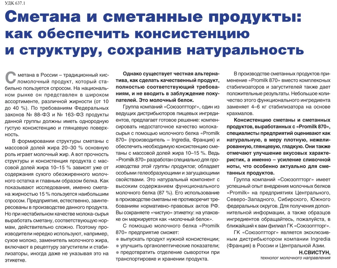 Группа компаний «Союзоптторг», один из ведущих дистрибьюторов пищевых ингредиентов, предлагает готовое решение: компенсировать недостаточное качество молока-сырья с помощью молочного белка Promilk 870 (производитель — Ingredia, Франция) и обеспечить необходимую консистенцию сметаны с массовой долей жира 10-15 %. Ведь Promilk 870 разработан специально для производства этой группы продуктов: обладает особыми гелеобразующими и загущающими свойствами.
