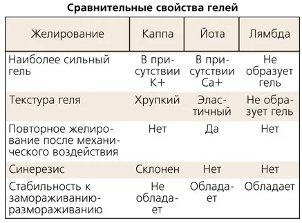 Наиболее прочные гели образует каппа-каррагинан в присутствии ионов кальция и калия. Однако ионы кальция, содержащиеся в молочных продуктах, делают гели каррагинана хрупкими и склонными к отделению влаги. В свою очередь, йота-каррагинан с ионами кальция образует прочные и эластичные гели с полным отсутствием синерезиса. Лямбда-каррагинан не желирует, однако образует вязкие растворы. Это свойство используется для формирования структуры и стабилизации частиц какао-порошка в быстрорастворимых напитках, шоколадном молоке, молочных шейках.