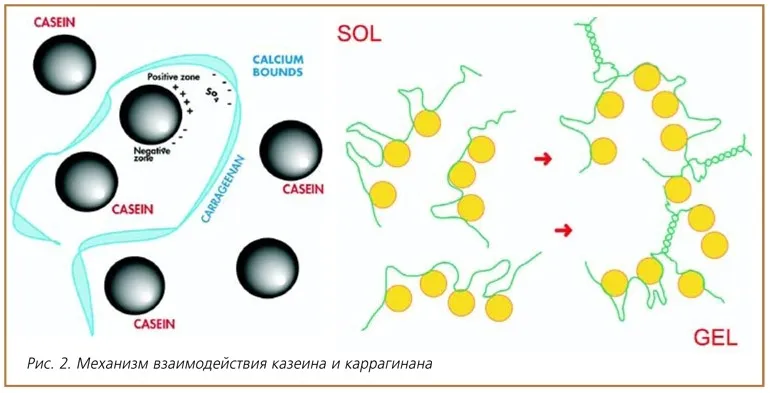 При значении рН выше изоэлектрической точки казеина ионы кальция, присутствующие в молоке, действуют как мостики между отрицательно заряженными карбоксильными группами молекулы казеина и отрицательно заряженными сульфатными остатками сложного эфира каррагинана.