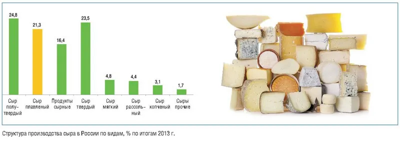 Плавленые сыры составляют значительную долю в структуре сыров, производимых в нашей стране. По данным маркетинговых исследований Росстата и Молочного союза России, они незначительно уступают полутвёрдым и твёрдым сырам (см. рисунок).